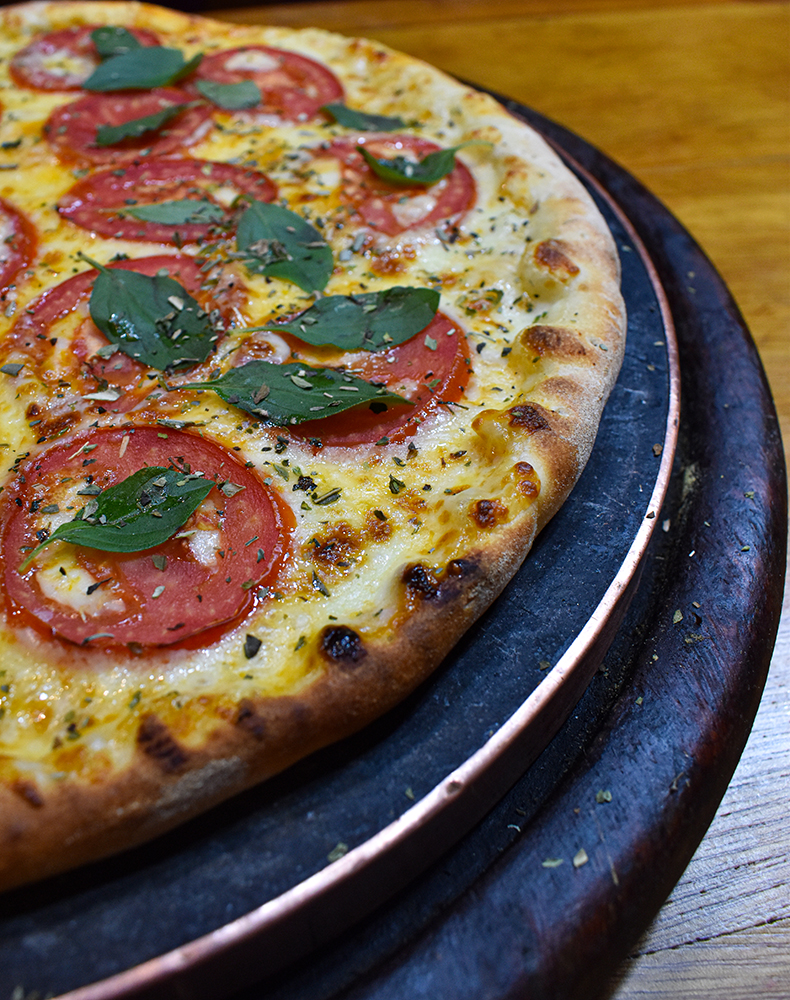 O cardápio com uma grande variedade de pratos, em especial as pizzas e as carnes na brasa servidas em tábuas de pedra.